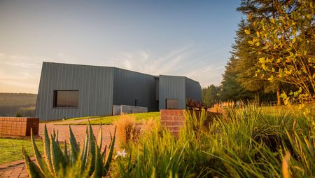 The Rheinzink dome hovers over a low concrete roof planted with restios which reflects the thatched roofed Nieu Cape Dutch style 1924 homestead and connected with a glass roofed passage.