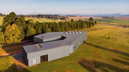 The design rationale behind the Louisvale Wines Wine Emporium is a marriage of the above elements embodied in a contemporary structure. The soft curve of the Rheinzink cladding reflects the shape and surface of the Khoekhoe reed mat hut, supported by curved steel rails, connected by floating glass to the polished concrete floor, infused with chips of perlemoen shell.