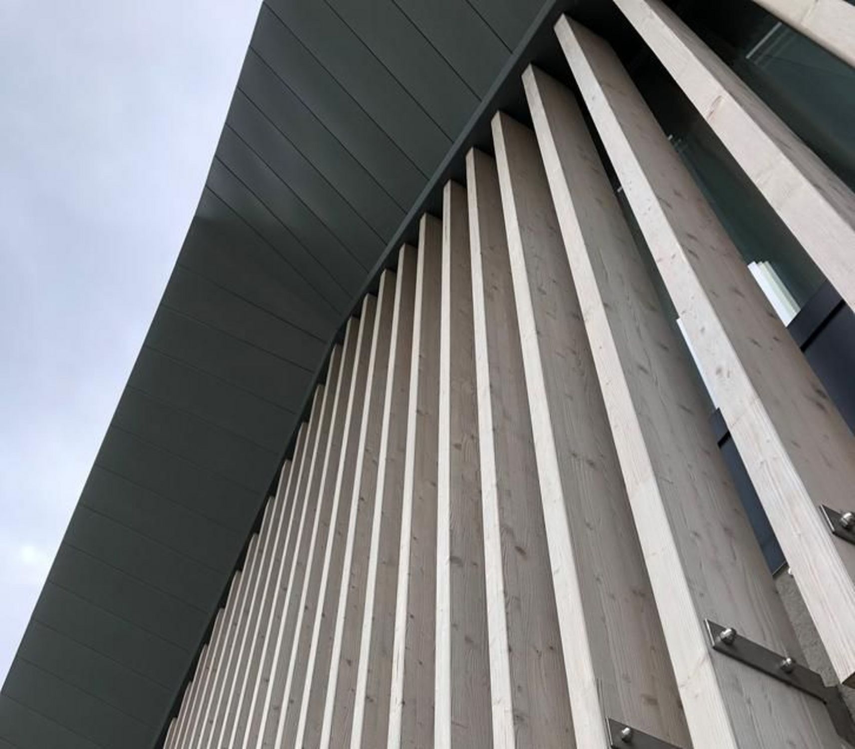 Facade: 129 m2, 0.9 tons, RHEINZINK- prePATINA ECO ZINC graphite-grey, angled-standing seam system