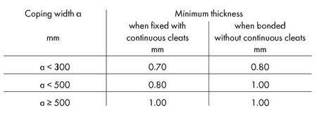 Wall copings are usually made in lengths of at least 3 m and indirectly attached for visual reasons, i.e. to prevent frequent transverse joints. The metal thickness depends on various factors: