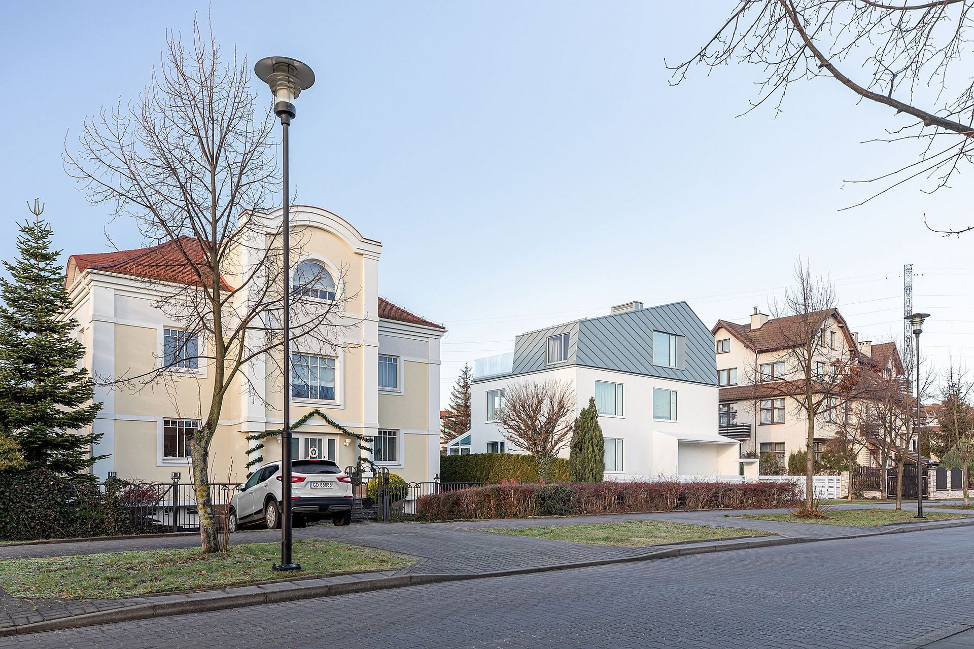 The "House with a Cap" project in Gdansk was built at the junction of two distinct districts. historical Oliwa and modern Przymorze. The volume was consciously integrated between neighboring buildings of different heights, and the roofline results directly from this relationship. The effect is a modern interpretation of a mansard roof, which organizes the building's proportions and adds a distinctive yet non-aggressive character.