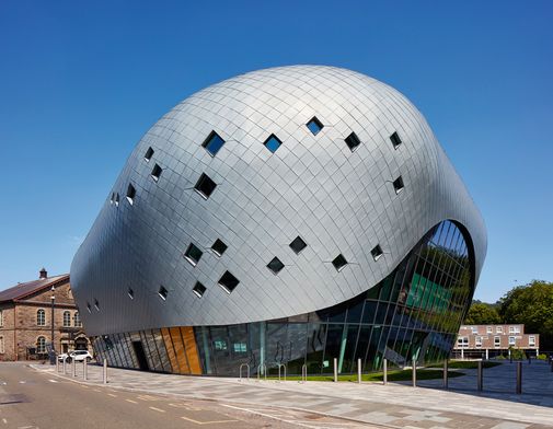 The futuristic building's striking curved walls were carefully constructed using a steel skeleton frame that was initially clad with precision-engineered laminated veneer lumber panels. Approximately 6,500 titanium zinc coulters from RHEINZINK in the surface quality prePATINA blue-grey were then installed on top of the wood cassettes of the façade. In choosing the material, the client and architect specifically went for a particularly natural material that plays into the concept of sustainability. This is further expressed in the use of solar panels, variable refrigerant flow air-source heat pumps, and one of the first hydrogen fuel cell CHP (combined heat and power) systems in Wales to generate heat and electricity.