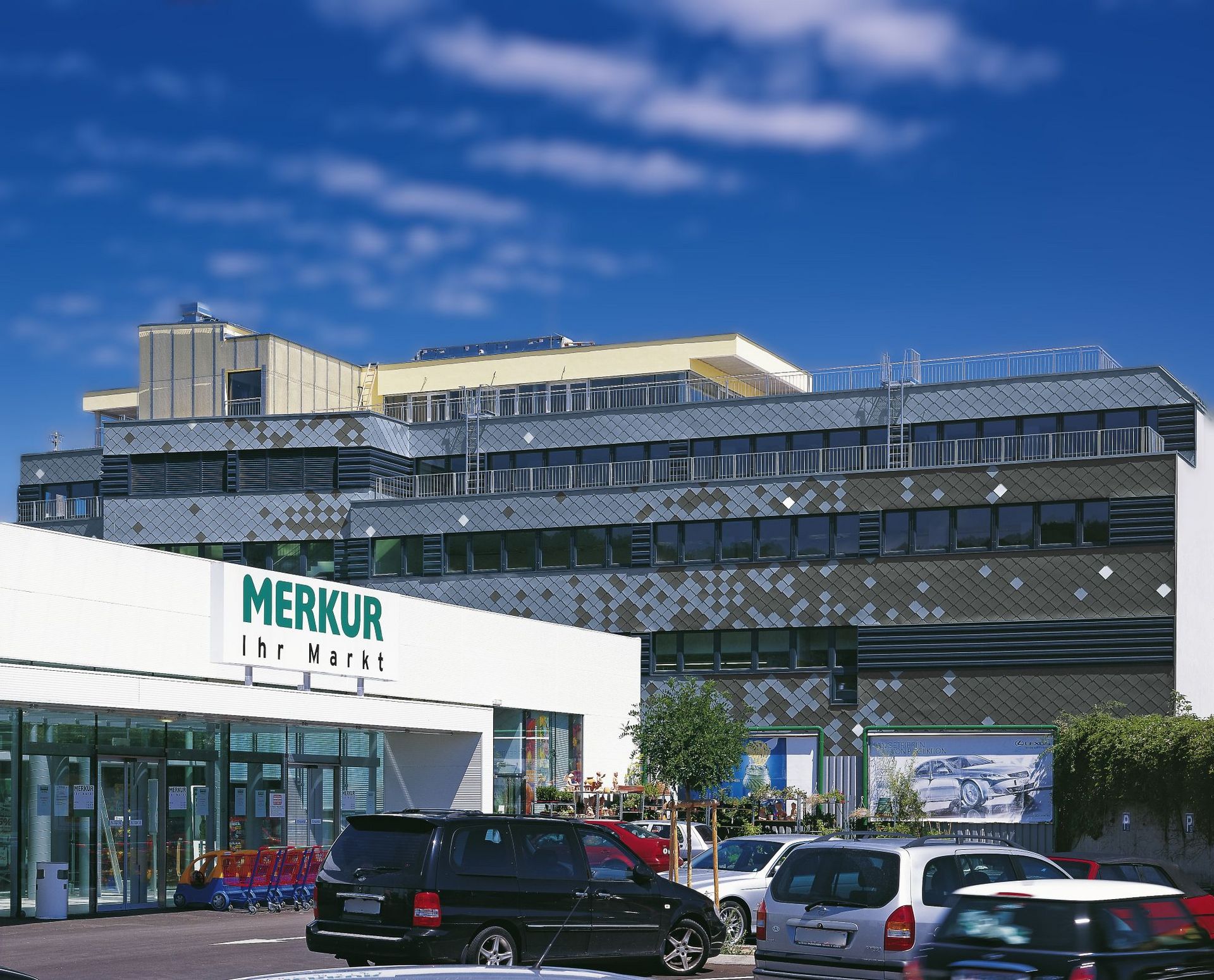 An unusual office and commercial building with more than 14,000 m² of usable space has been constructed at the Bergmillergasse 5 site in Vienna. What makes this building unique is its façade. For the first time, an architect has created such a large façade using small square tiles made of RHEINZINK. Until now, this tile shape has been used primarily for roofs, corners, small surfaces, and complex forms. Integrated into the large surface, the tiles form an oversized mosaic with an iridescent surface that reflects the colors of the sky in a shimmering display depending on the weather. With this “snakeskin surface,” the office and commercial building presents itself as bold and extravagant without appearing overly strange. Architect Georg Petrovic arranged the three different tile surfaces into an artistic design for this purpose. RHEINZINK square tiles in prePATINA blue-grey and graphite-grey, along with CLASSIC bright-rolled, form the shimmering, scale-like outer skin of the building in shifting formations.