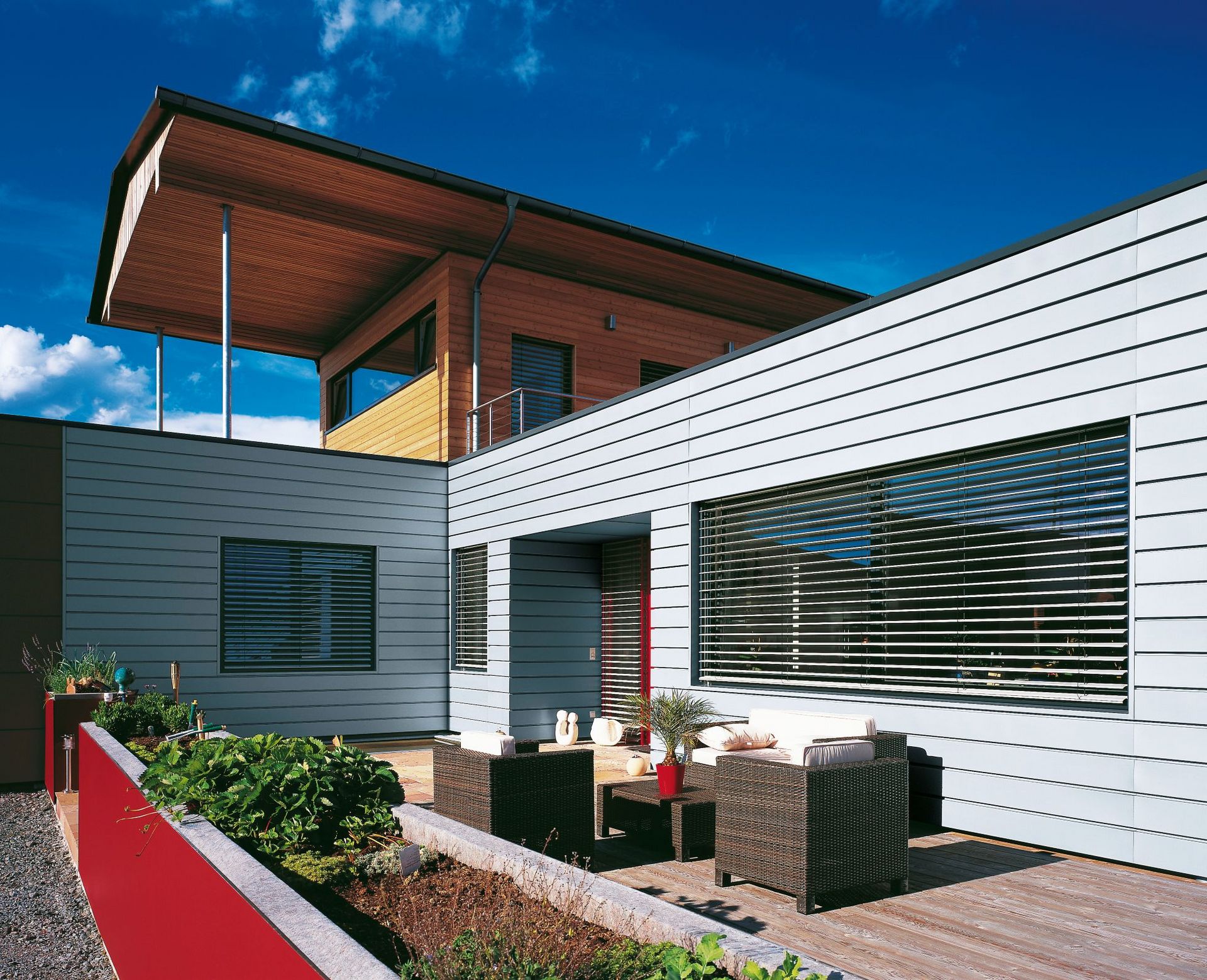 On the flat roof of the elongated T-shaped building, a house for the son was constructed using larch; the wide eaves of the RHEINZINK roof protect the facade, ensuring that the honey-yellow hue of the wood is preserved. The horizontal wood cladding is continued on the lower section of the building via RHEINZINK horizontal panels, which have been so meticulously crafted that they appear as if drawn with a ruler. The garage extension is finished in wine red, while the RHEINZINK façade is blue-gray; the colors break up the large structure and harmoniously complement one another. Larch, when properly treated, can last for many centuries without maintenance; wooden churches in Sweden bear clear witness to this. The pre-weathered blue-gray RHEINZINK roof and façade offer the same durability. A quality that fits very well into the value-conscious environment of Styria.