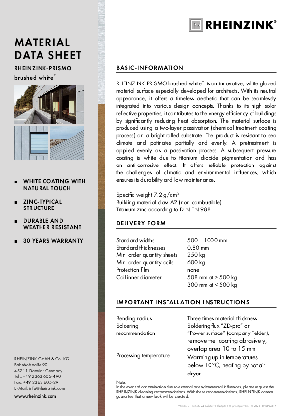 Type General (109) Press (4) References (52) Download (72) search previous56789next Friedrichshof … of the courtyard picks up on the historical form of the three-sided courtyard, but interprets it in… House of Four Gables …A second life for the historic coachman's house Transforming a 140-year-old carriage house for the next… RHEINZINK-GRANUM EXTRA basalte Material data sheet pdf 370 KB RHEINZINK-prePATINA ECO ZINC blaugrau Materialdatenblatt pdf 494 KB RHEINZINK-Produktlinien Hinweise zu Material und Verarbeitung pdf 7 MB RHEINZINK Product Lines …Information on Material and Processing pdf 792 KB RHEINZINK is Madaster Innovation Partner in the Madaster ecosystem "Sustainability is at the heart of the corporate strategy. Within the framework of the management systems, the company management sees itself as an "enabler" for sustainability, in which it RHEINZINK-GRANUM EXTRA granite Material data sheet pdf 276 KB RHEINZINK-PRISMO brushed white+ Material data sheet pdf 200 KB Circular Economy … rather than being reused in a lower-quality form (downcycling) or ultimately ending up in landfill.… previous56789next rheinzink-logo-black-without-whitespace You are on our global website. Would you like to stay on rheinzink.com or visit the local RHEINZINK America website?Stay on rheinzink.comGo to RHEINZINK America