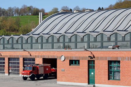 Functionality and beauty have merged for 45 years at the fire brigade school in Lappersdorf. In 1977, the Regensburg Land Building Authority decided on exposed brickwork and RHEINZINK roofing. This is still the visual focal point of the facility, which has already been extended twice, even after decades. The patinated grey roof surface made of RHEINZINK still provides a beautiful contrast to the red colour of the brickwork.
